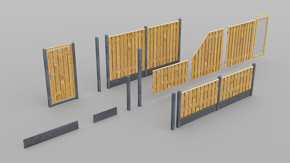 A building kit for a garden fence. The high and low versions are setup for use with the Blender Array modifier. A single pole as End Cap.